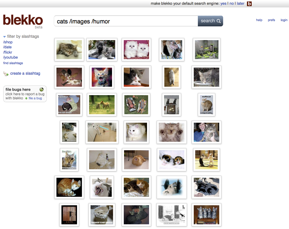 Una soluzione un po' da smanettoni e un po' social, insomma, che dovrebbe avere il pregio di eliminare i link non pertinenti e soprattutto le "content farm", i siti-esca che contengono parole chiave disposte a casaccio per attirare traffico ma non forniscono contenuti reali (e anzi spesso offrono infezioni). Il limite di Blekko è che per ora offre solo slashtag in inglese e ha bisogno di fondi per poter gestire il servizio. Ce la farà, o verrà fagocitato da Google? Vedremo. Nel frattempo Blekko ha già raggiunto il traguardo fondamentale di utilità della Rete, che è fornire con precisione immagini di gatti in pose divertenti senza infiltrazioni di altre immagini non pertinenti o osé: basta digitare "cats /images /humor" per ottenere oltre 5,8 milioni di risultati. Una scorta sufficiente.